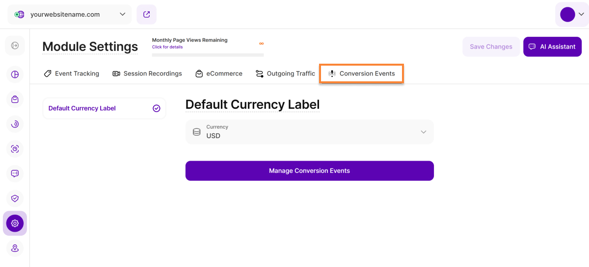 This section of the Module Settings allows you to set the default currency for all your Conversion events. The current default currency is USD.