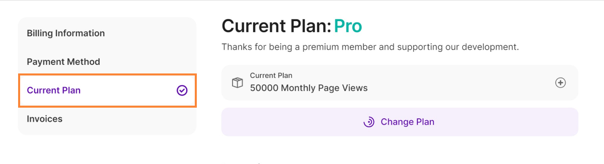 This section empowers you to manage all aspects of your website's billing conveniently. You can enter your billing information, manage your payment method, choose the perfect pricing plan based on your website traffic and view your invoices.