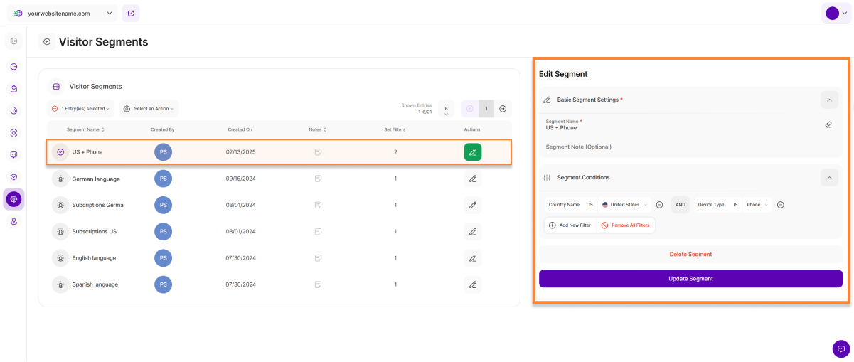 - On the Visitor Segments table, choose the specific segment that you want to edit by tapping the pencil icon under the Actions column to enter the editing mode for this segment.
