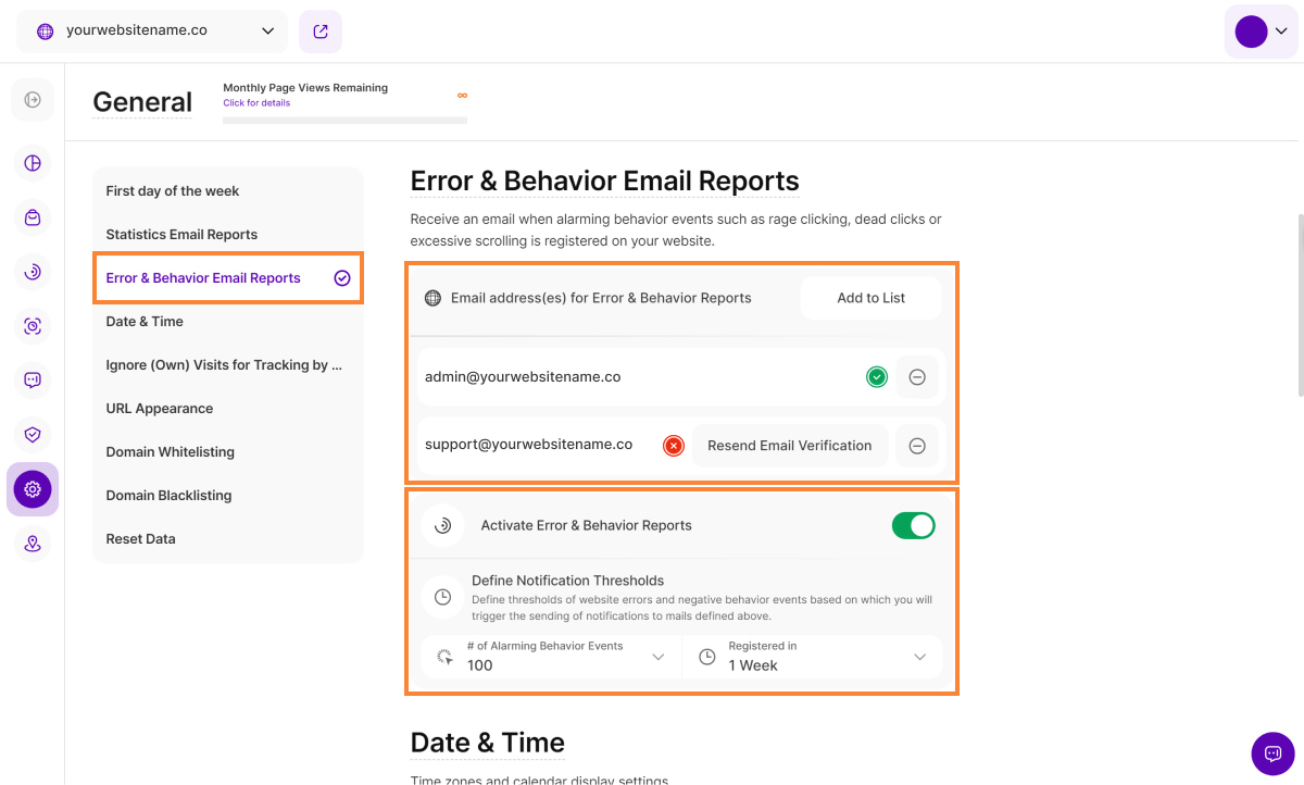 Set up email adddresses to which error alert reports can be sent when alarming behavior events (ABEs) are detected on your website, such as rage clicks, dead clicks, or excessive scrolling.