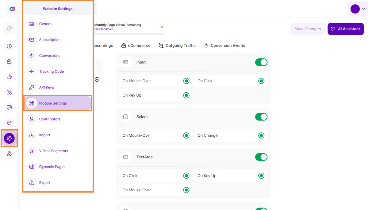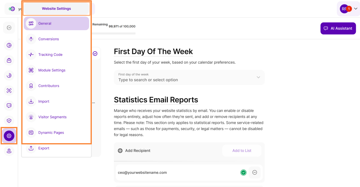 In the Website Settings module, you can manage specific components of your website such as general settings, subscription, visitor segments, export and more. If you have more than one website to manage, you can switch between them using the drop-down menu in the top left corner.