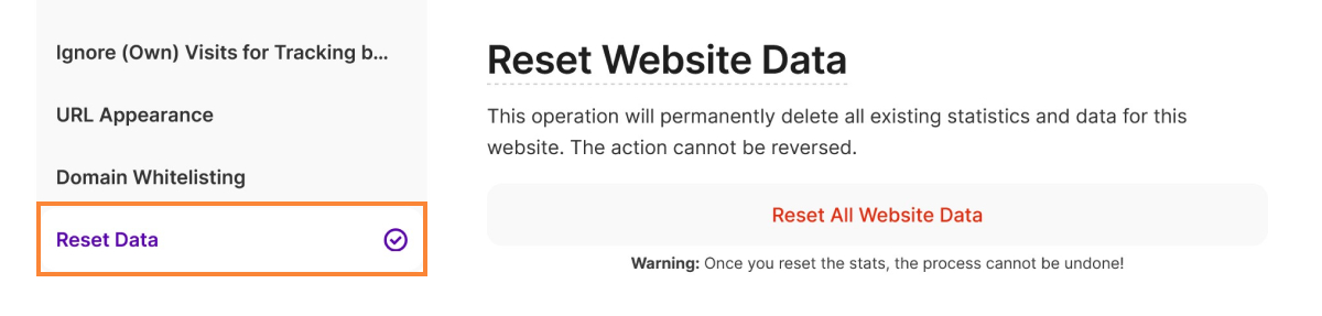This option allows website owners to permanently erase all tracking data associated with this website within our application. The action, which can only be performed by a website owner, will remove all your statistics from your account. Your preferences will be kept the same as before. You will have to confirm this action by entering your password.