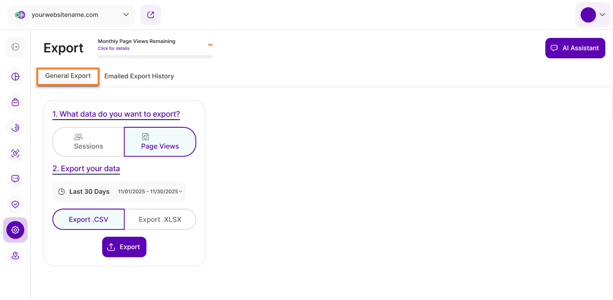 - Choose Your Data: Select whether you want to export Sessions data or Page Views (formerly "Visits") history, depending on your specific needs.