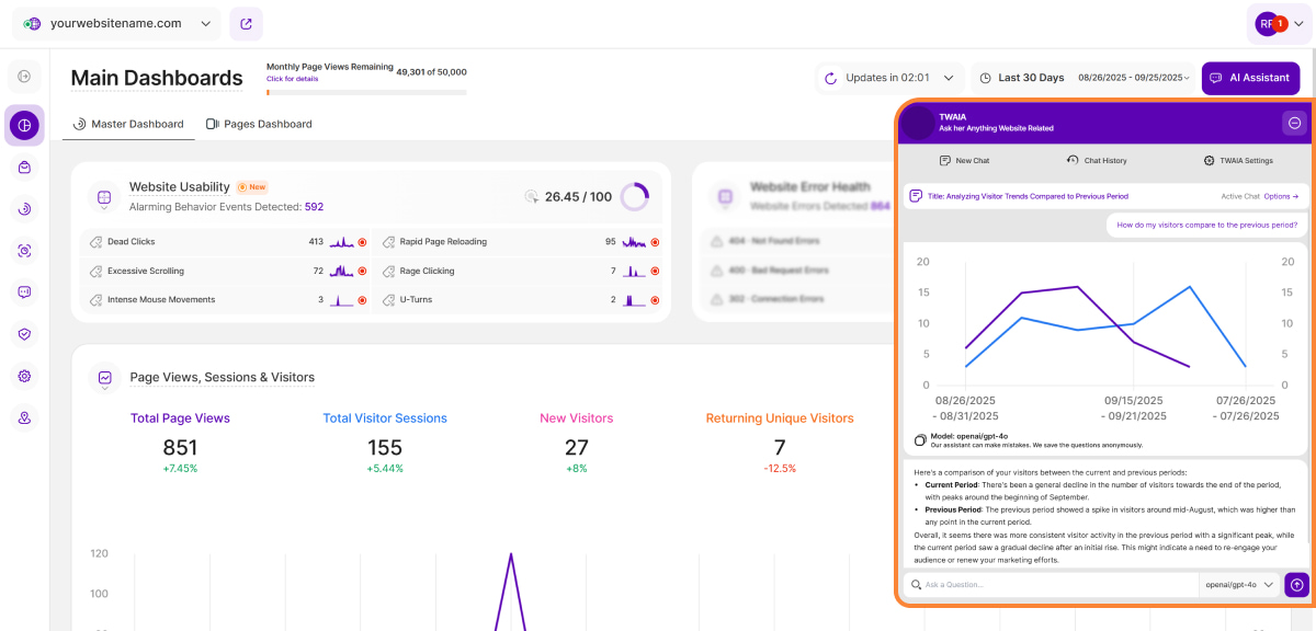 The AI Assistant button is in the top-right corner of the dashboard, right next to the date picker. When clicked, this button will open a modal sliding in from the right that hosts TWAIA, our AI-powered platform assistant.