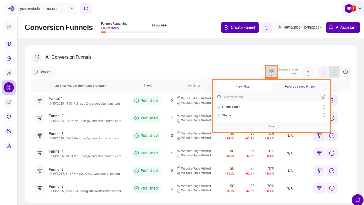 - Funnel Name, Creation Date & Creator: This column displays the name of the funnel, the date and time it was created and the name of the creator.